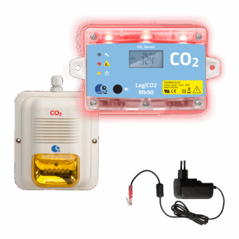 This complete plug and play SET contains a Mk90 CO2 Sensor with display, a Horn/strobe, cabling and signage. The Mk90 CO2 Stand-Alone SET, provides a sophisticated and powerful CO2 Safety System while still being the most economical and easiest system on the market. All LogiCO2 sensors have automatically calibration as standard. The alarm levels can be changed to any level to comply with all local Safety Codes and legislation.
